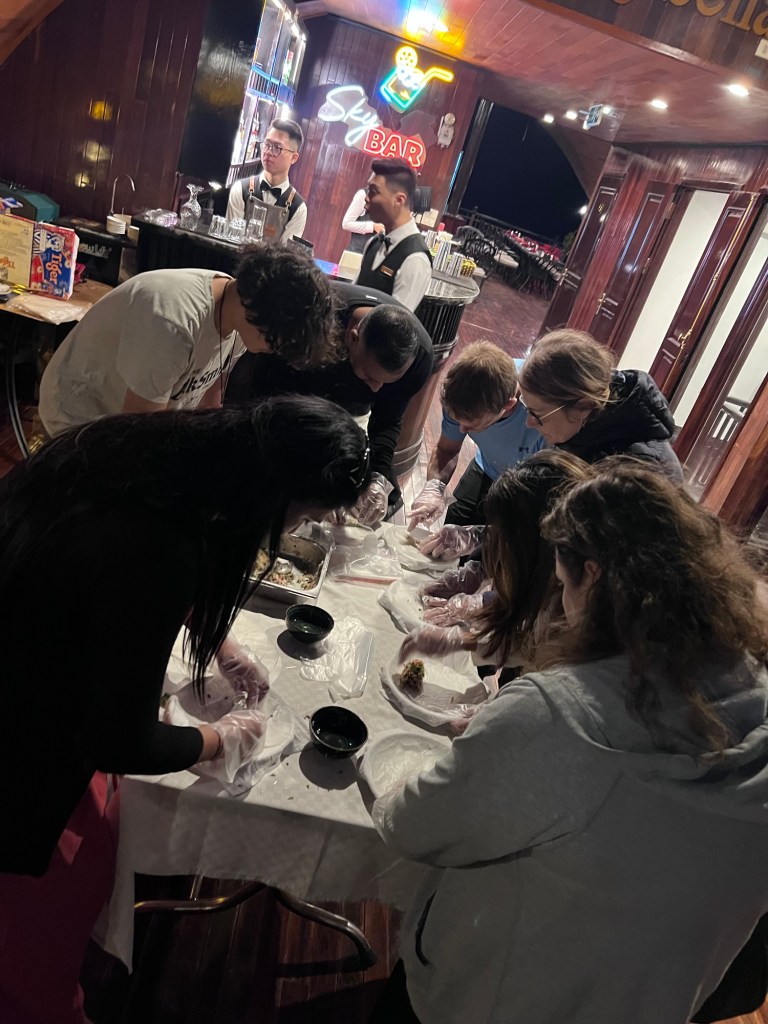 Back onboard, Tom had arranged for a variety of group activities that the 10 of us and 6 others could partake in. Ranging from karaoke, squid fishing or simply enjoying the view but the3 most interesting of which was a spring roll cooking class and competition that he led to provide a receipt of a traditional spring roll but more importantly, how to roll it. One by one we grabbed our rice paper and filled our spring rolls and after a tense and prolonged determination, my spring roll tied for first place with an Italian woman (lucky event #2) where I won another local beer.